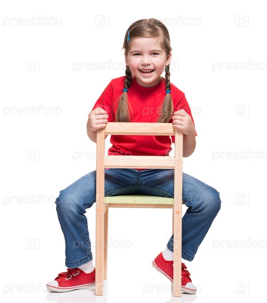 Девочка в красной футболке позирует на стуле
