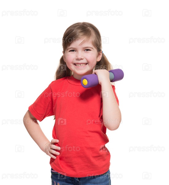 Девочка в красной футболке держит гантели для фитнесса