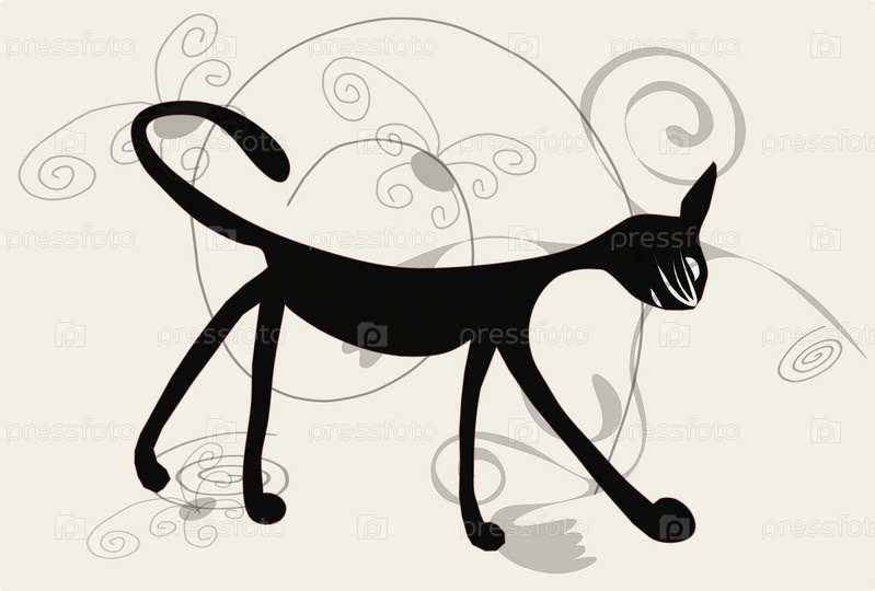 Черный кот на белом фоне с разными элементами