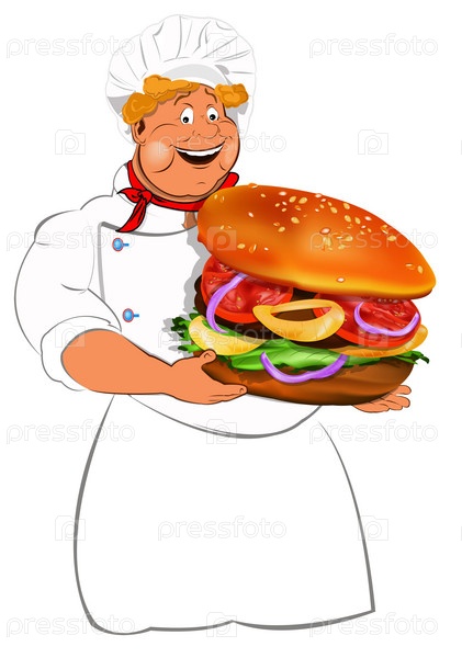 Шеф-повар с большим традиционным аппетитным гамбургером на белом фоне