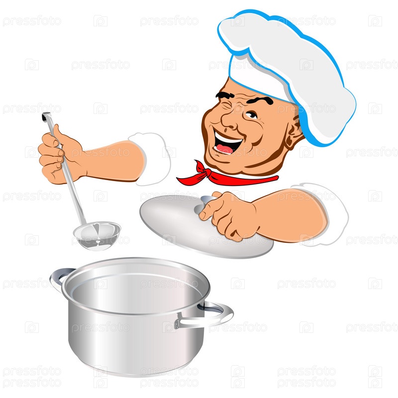 Шеф-повар с половником и металлической кастрюлей на белом фоне
