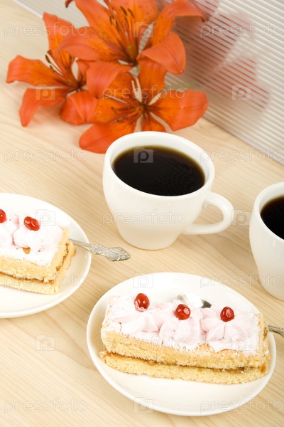 Цветы лилии и десерт с кофе