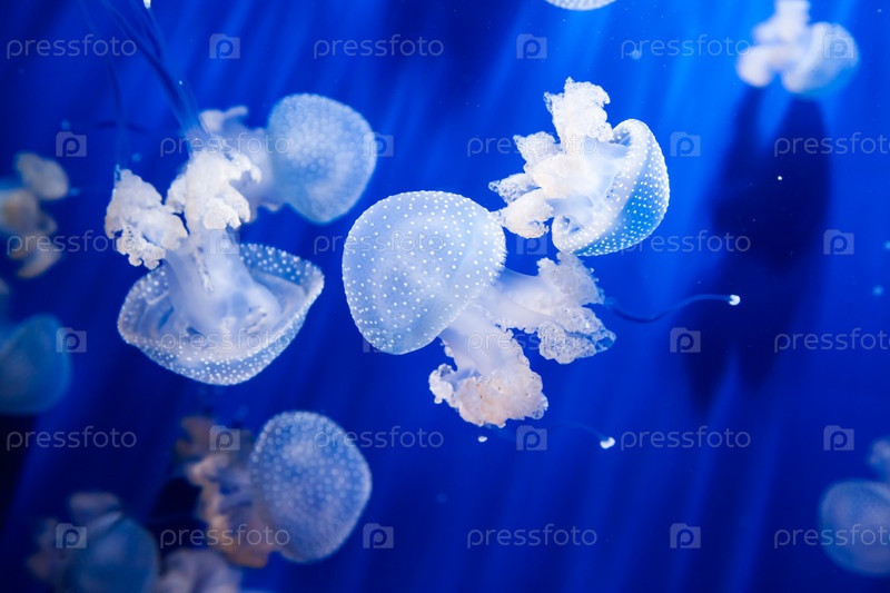 Медузы в аквариуме с голубой водой