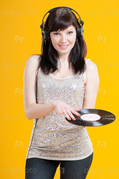 Улыбающаяся женщина-диджей в наушниках держит виниловую пластинку