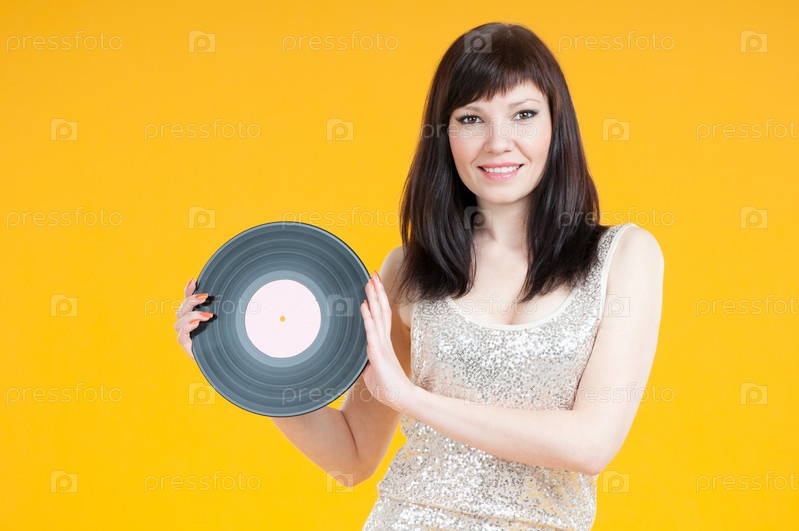 Улыбающаяся девушка держит виниловую пластинку на желтом фоне