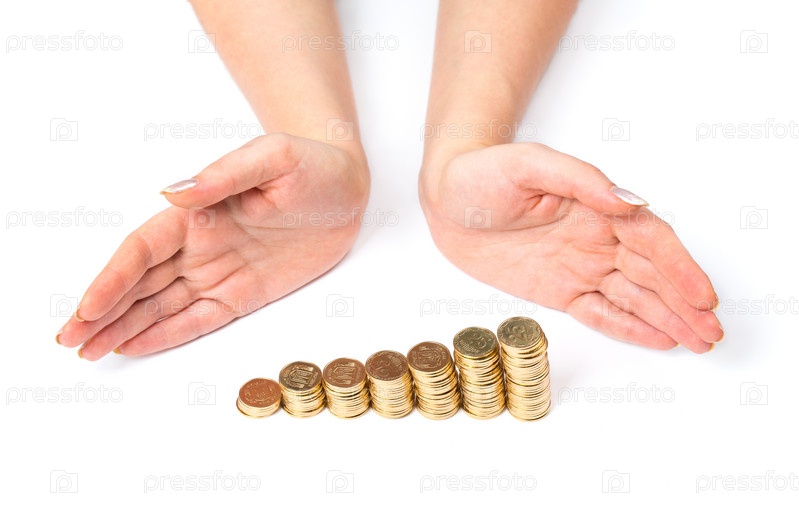 Руки и монеты на белом фоне