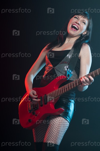 Эмоциональная молодая женщина играет на электрогитаре