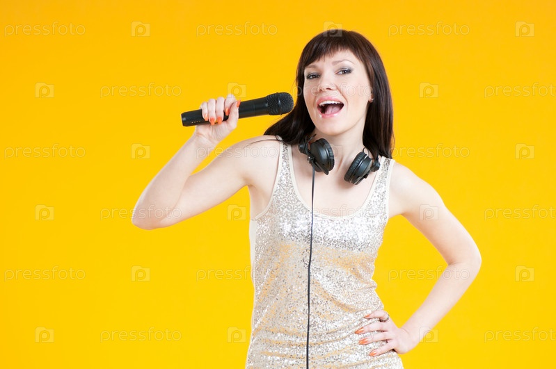 Очаровательная женщина поет в микрофон на желтом фоне
