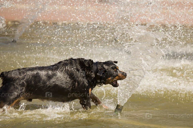 Счастливый ротвейлера играет в фонтане