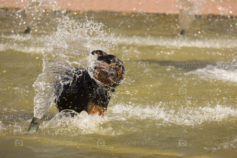 Счастливый ротвейлера играет в фонтане