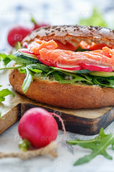 Свежий рогалик с рукколой, редькой и копченой форелью