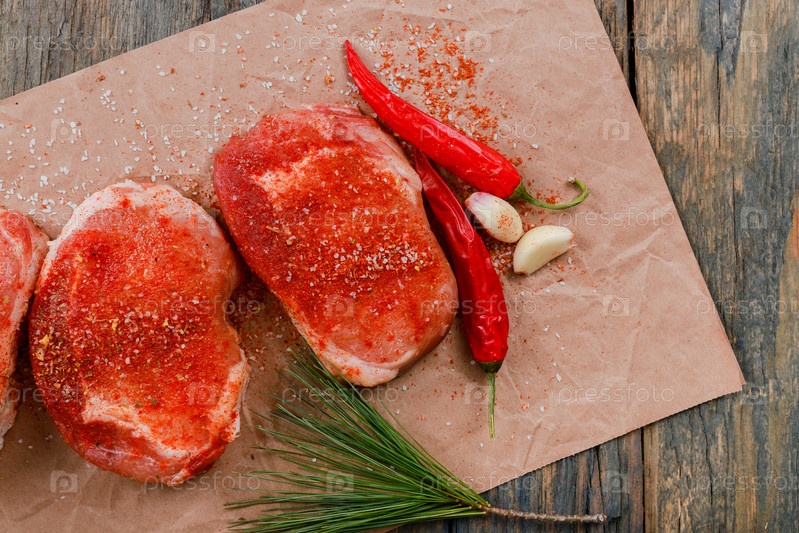 Сырые свежие мраморные стейки и приправы на темном фоне