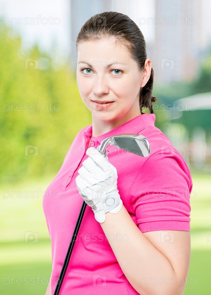 Гольфист с мячом и клюшкой на фоне поля для гольфа