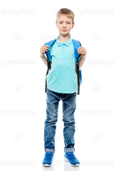 Школьник 8 лет в футболке и джинсах на белом фоне