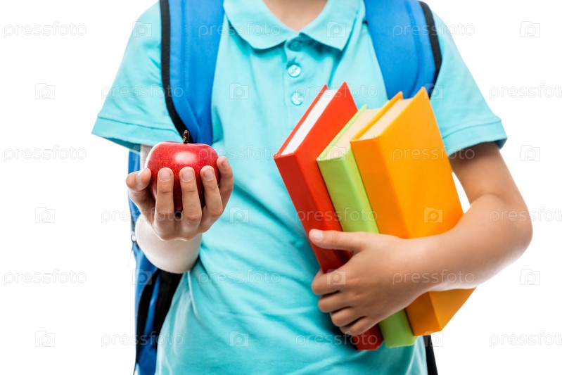 Красное сочное яблоко в руках школьника