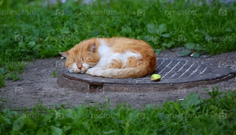 Кот спит на крышке люка
