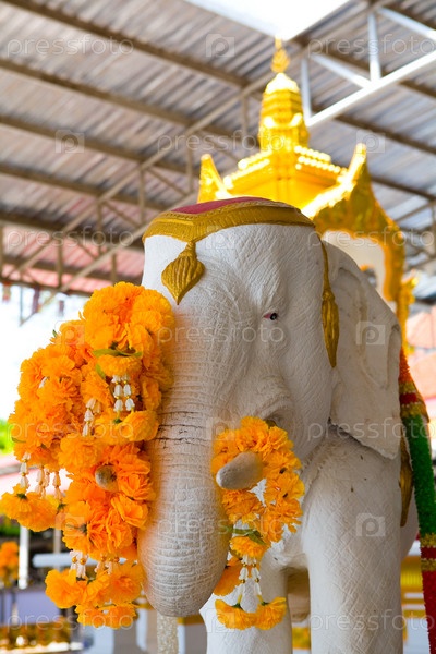 Скульптура слона украшена оранжевыми цветами