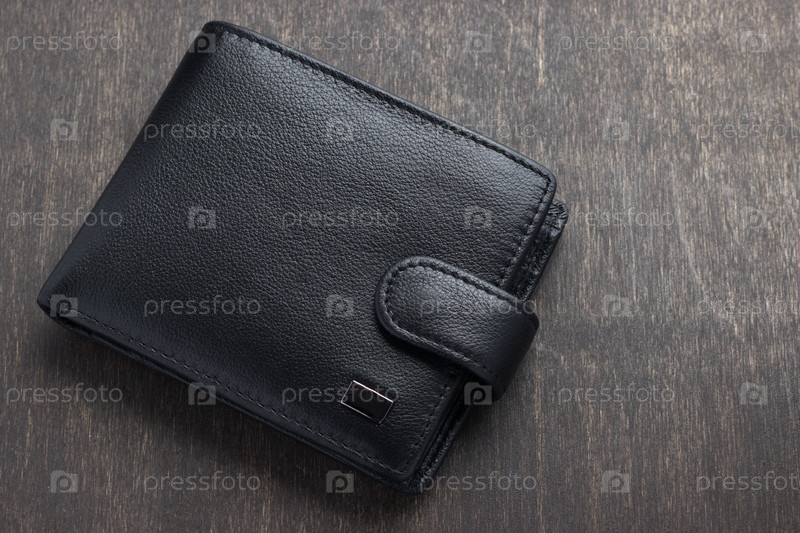 Черный кожаный бумажник на деревянном фоне