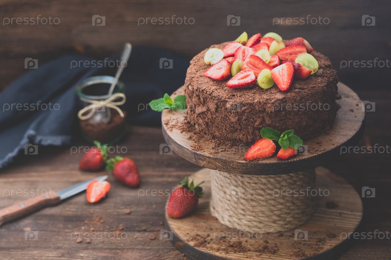 Шоколадный торт Наполеон с клубникой на деревянном фоне