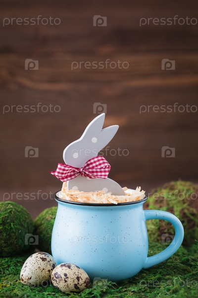 Кролик в синей чашке на фоне травы