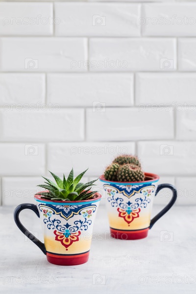 Кактусы в красочных восточных чашках