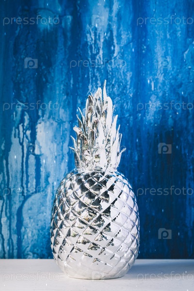 Искусственный серебряный ананас на синем фоне