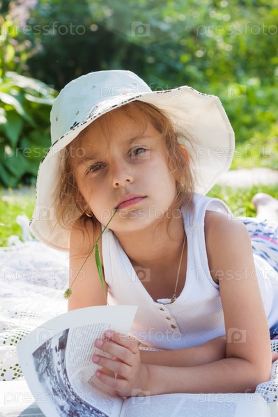 Маленькая девочка читает книгу в саду