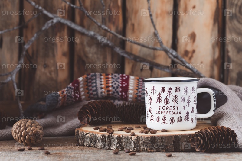 Белая керамическая чашка кофе на деревенском деревянном фоне с шишками и вязаными свитерами