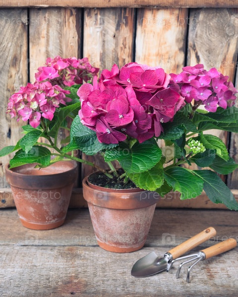 Фиолетовые гортензии в винтажном горшке с садовыми инструментами