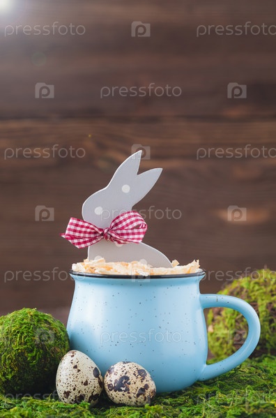 Фигурка серого кролика в синей чашке на фоне травы