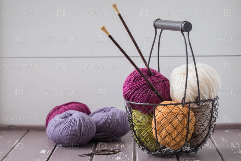Красочная шерстяная пряжа в железной корзине с деревянными спицами