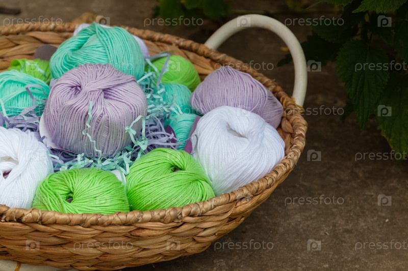 Красочные мотки шерстяной пряжи в корзине на деревенском фоне