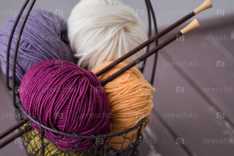 Красочная шерстяная пряжа в железной корзине с деревянными спицами