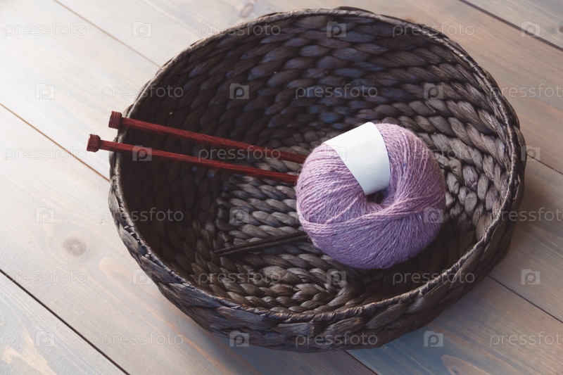 Пряжа и спицы в корзине на деревянном фоне
