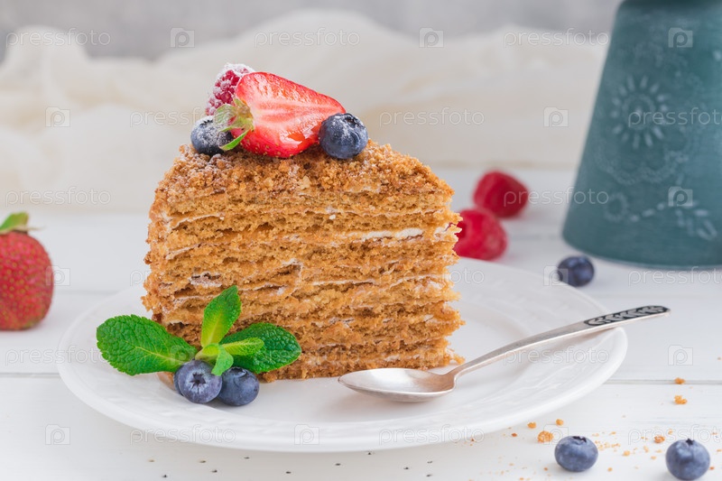 Кусок домашнего медового торта с клубникой, черникой и малиной на светлом фоне