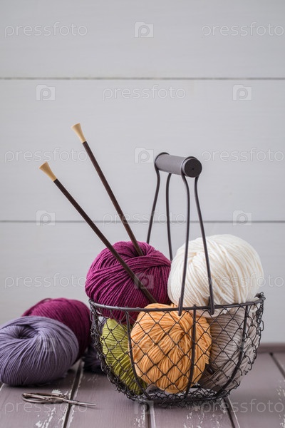 Красочная шерстяная пряжа в железной корзине с деревянными спицами