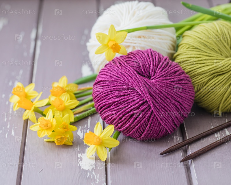 Шерстяная пряжа, спицы с желтыми нарциссами
