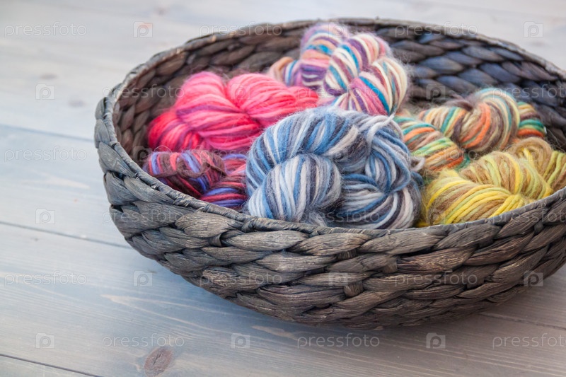 Красочные мотки пряжи в корзине на деревенском фоне