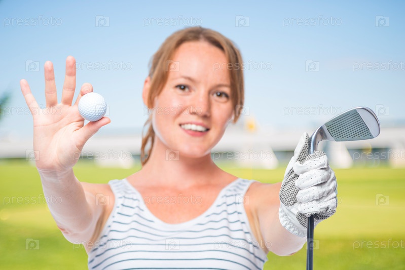 Девушка показывает мяч и гольф-клюшку