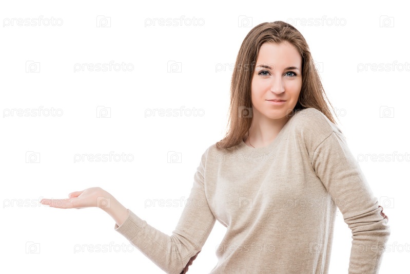 Красивая девушка держит ладонь на белом фоне