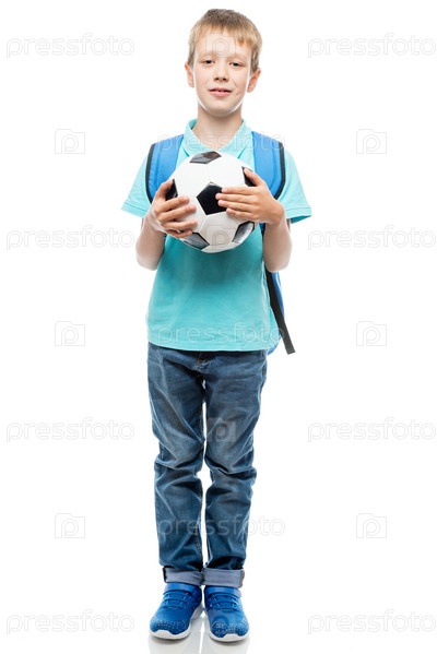 Портрет школьника с футбольным мячом на белом фоне