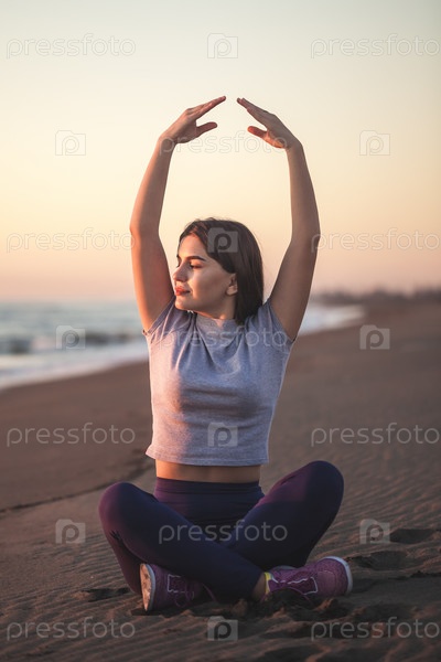 Красивая молодая женщина делает упражнение на песчаном пляже