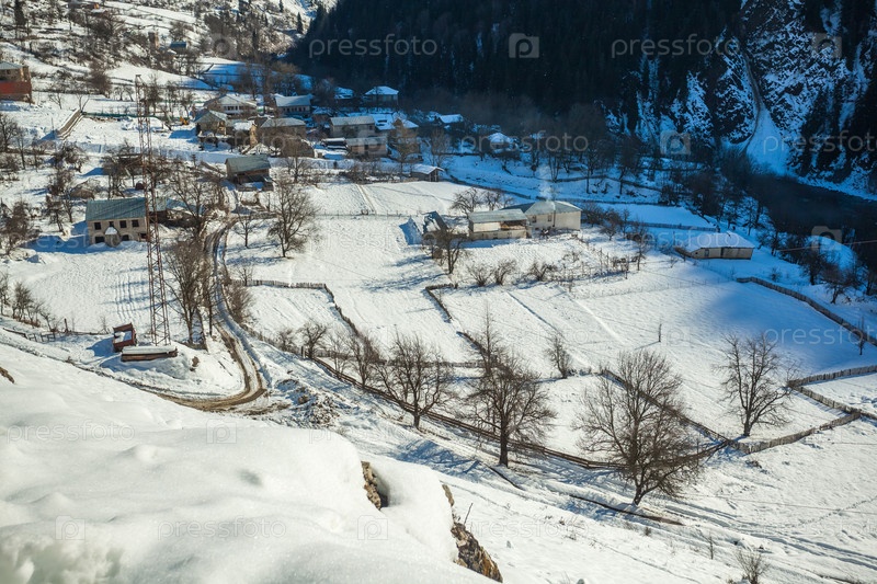 Горная деревня в горах Кавказа в зимнее время, Сванетия, Грузия