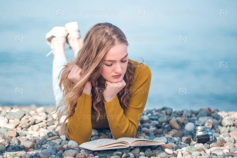 Красивая блондинка читает книгу на пляже
