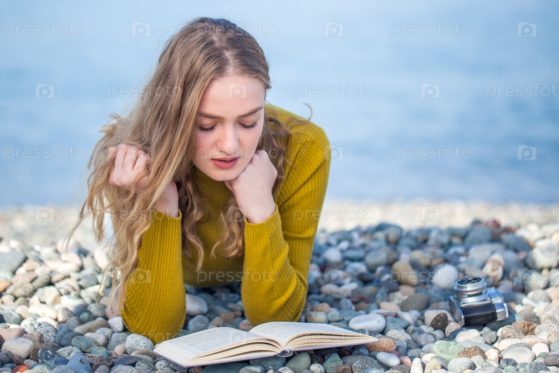 Красивая блондинка читает книгу на пляже