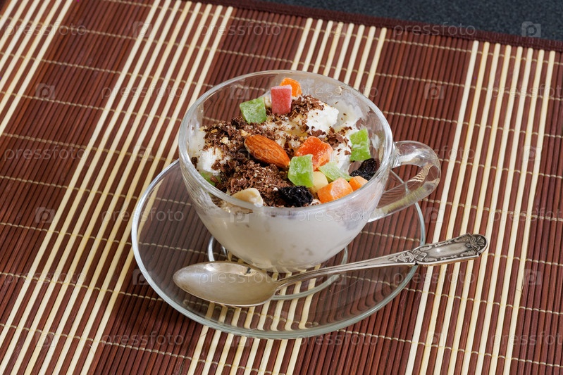 Мороженное с изюмом, шоколадом и сухофруктами в стеклянной чашке