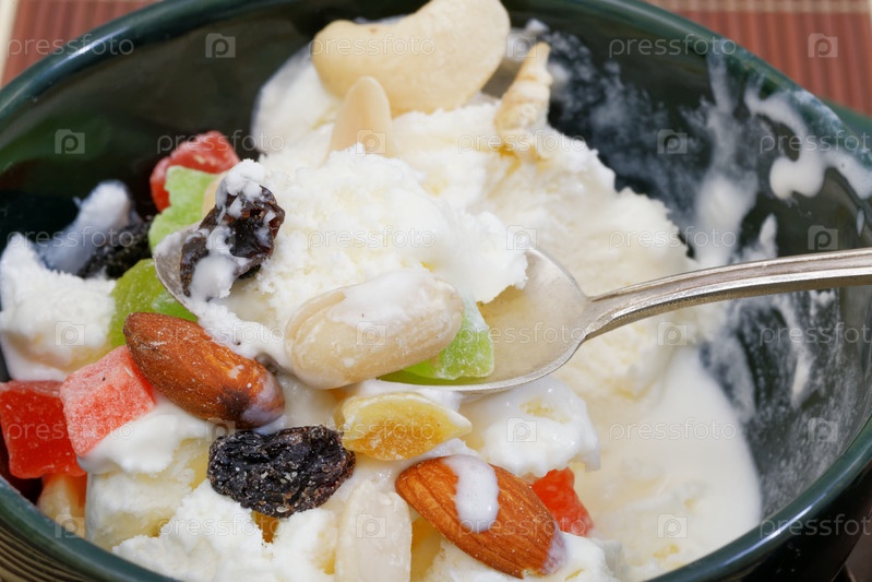 Мороженное с изюмом, шоколадом и сухофруктами в чашке