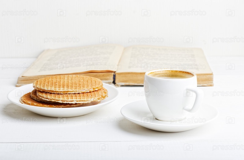 Чашка эспрессо, вафли и книга