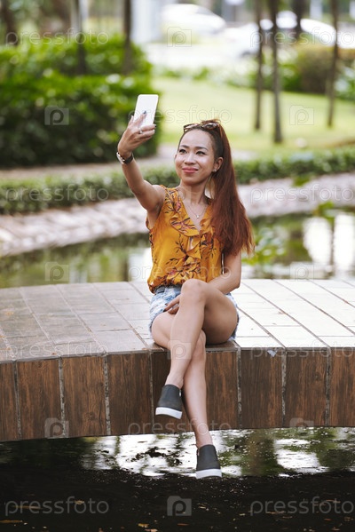 Красивая женщина фотографируется на открытом воздухе