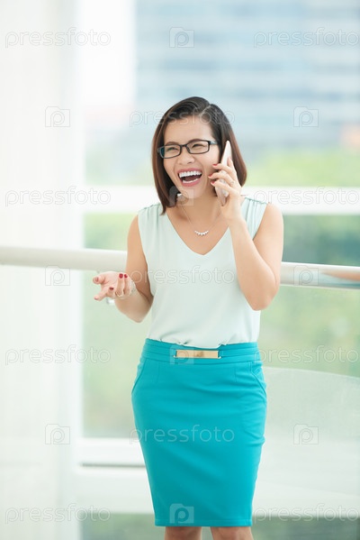 Веселая деловая женщина говорит по телефону